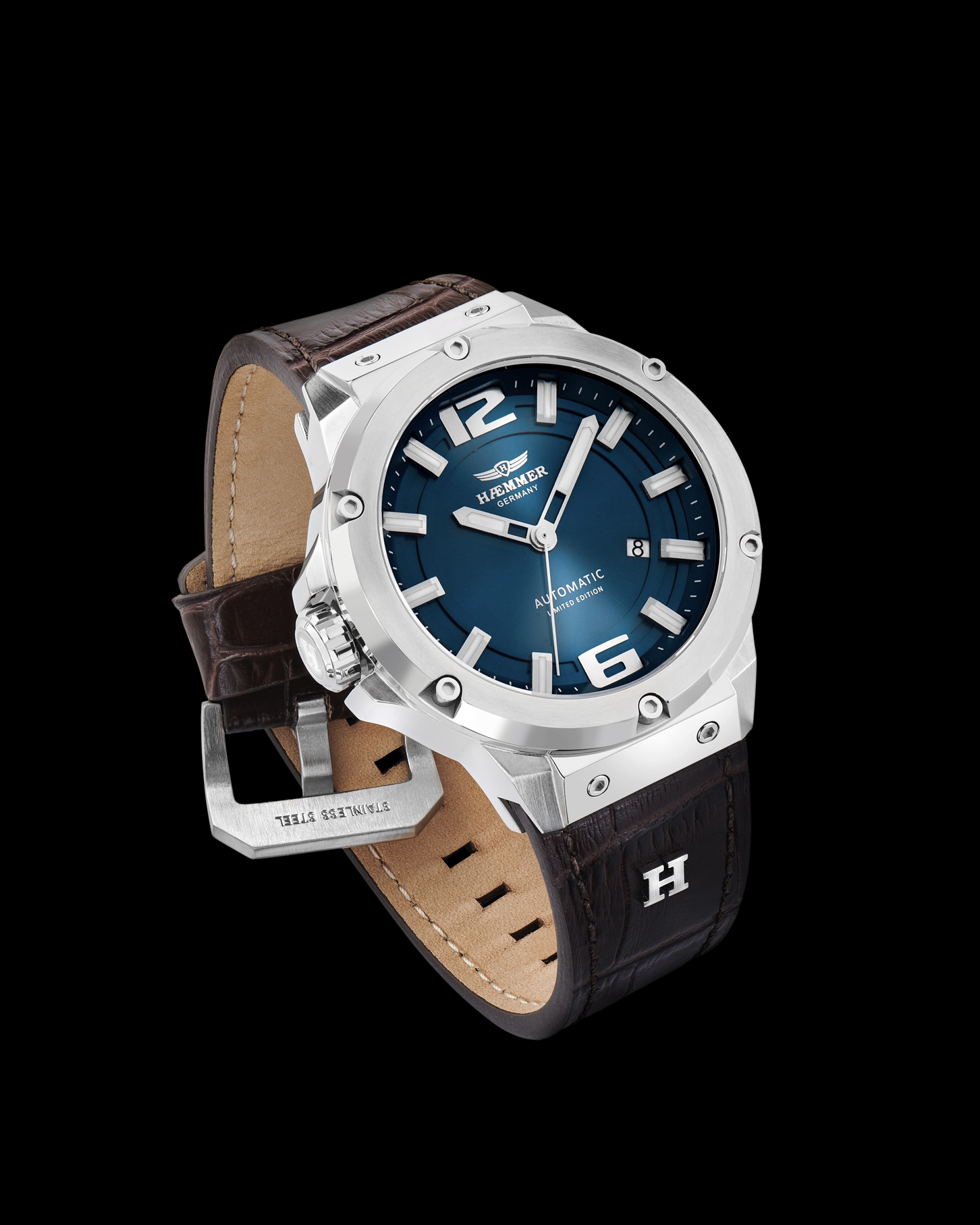| Armband & Schließe: | Krokogeprägtes Kalbsleder-Armband, aus gebürsteten 316L Edelstahl (matt), mit Dornschließe |