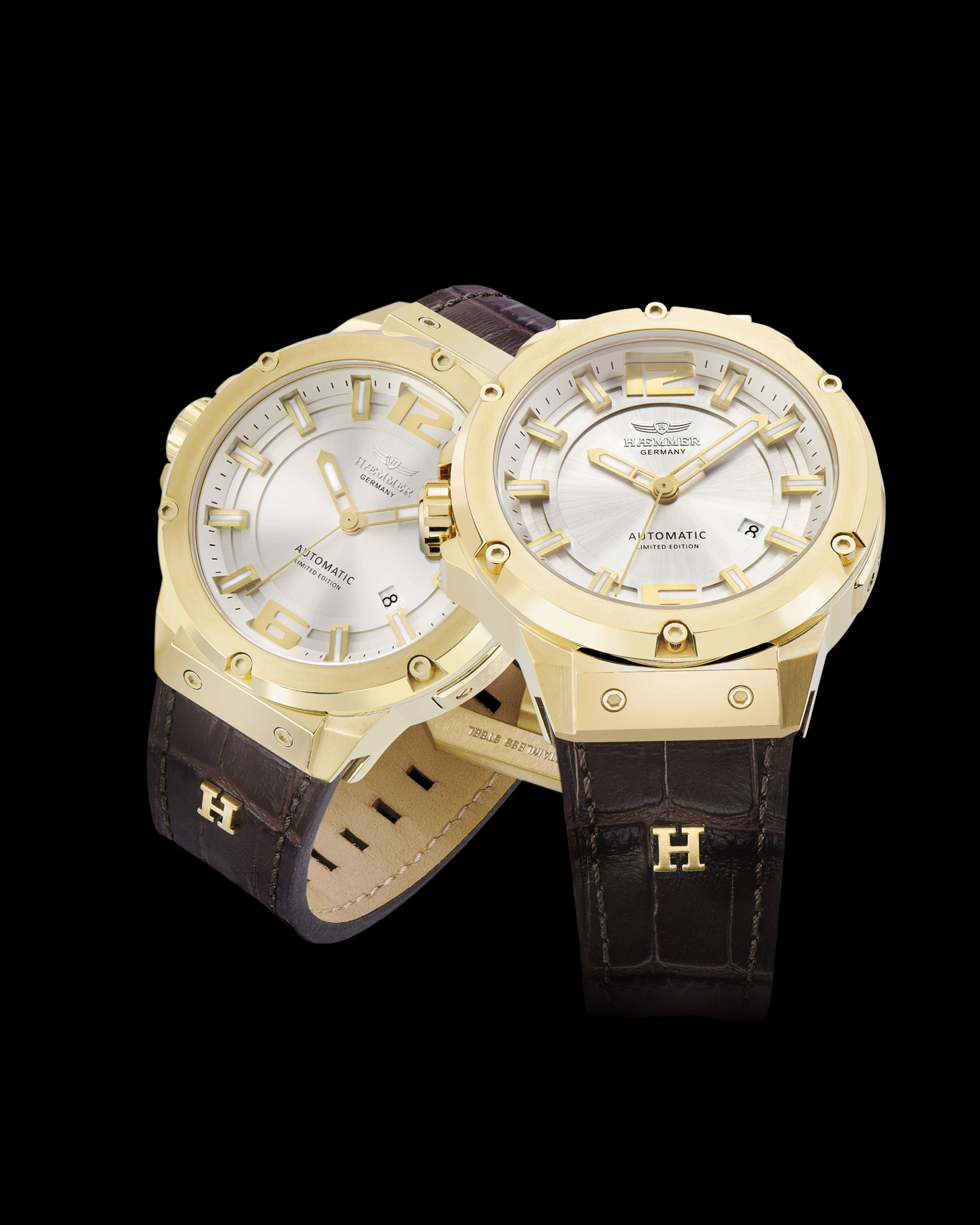 | Edelstahlelemente: | "HÆMMER" Lasergravur auf poliertem 316L Edelstahl, Beschichtung: IP-Gold |