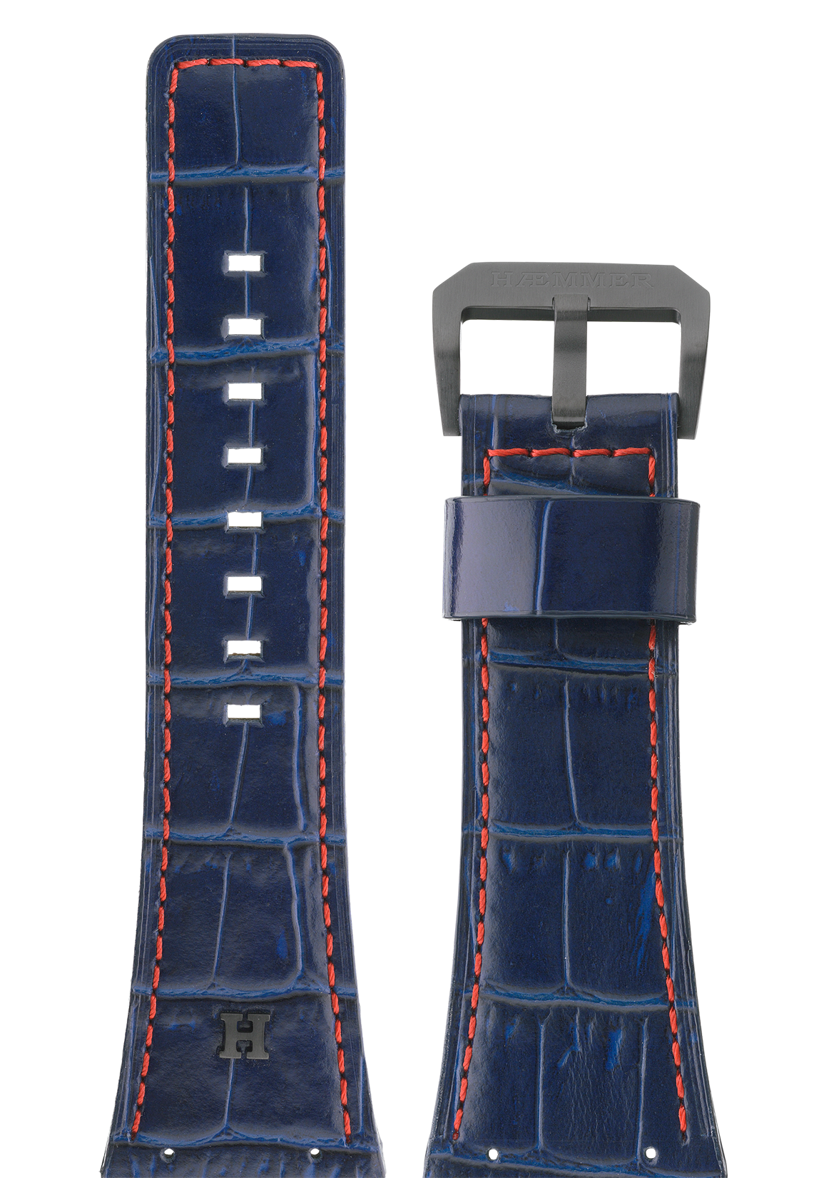| Armband & Schließe: | IP-Black beschichtet, Krokogeprägtes Kalbsleder-Armband, aus gebürsteten 316L Edelstahl (matt), mit Dornschließe |