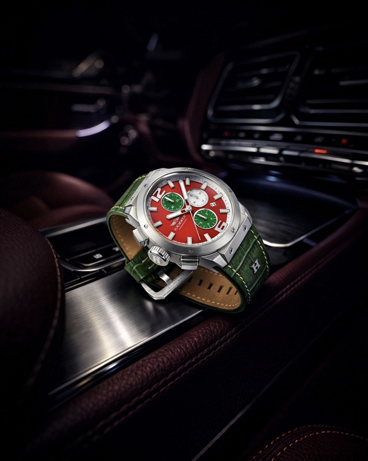 Das signalstarke Rot des Zifferblatts ist ein Symbol des reinen, ungebändigten Willens und des Feuers, das dich antreibt. Es ist die unübersehbare Kraft, die von dir ausgeht. Das selbstbewusste Grün des Armbands und der Akzente steht dabei für die Beharrlichkeit und die natürliche Dominanz, mit der du deinen Raum einnimmst.