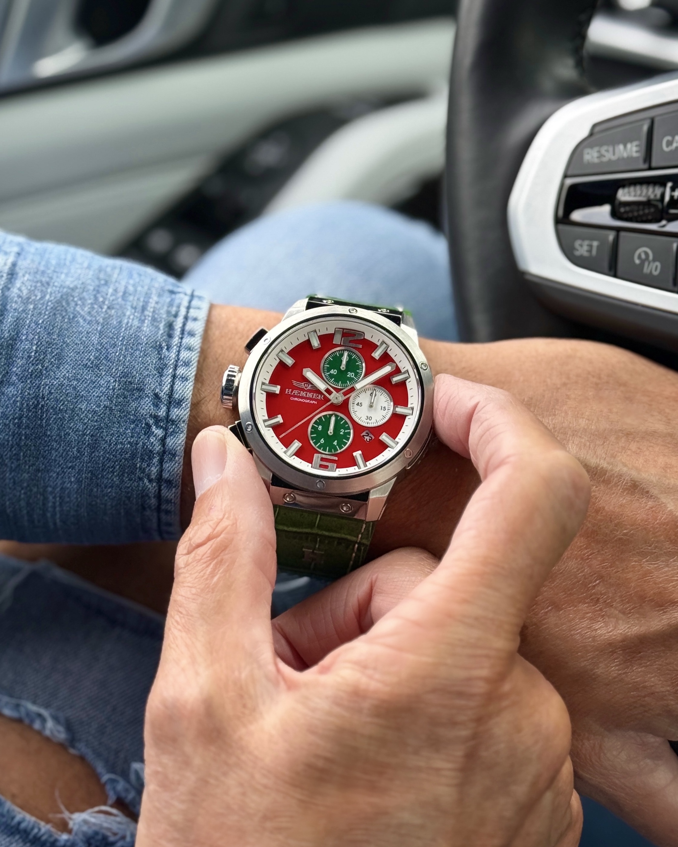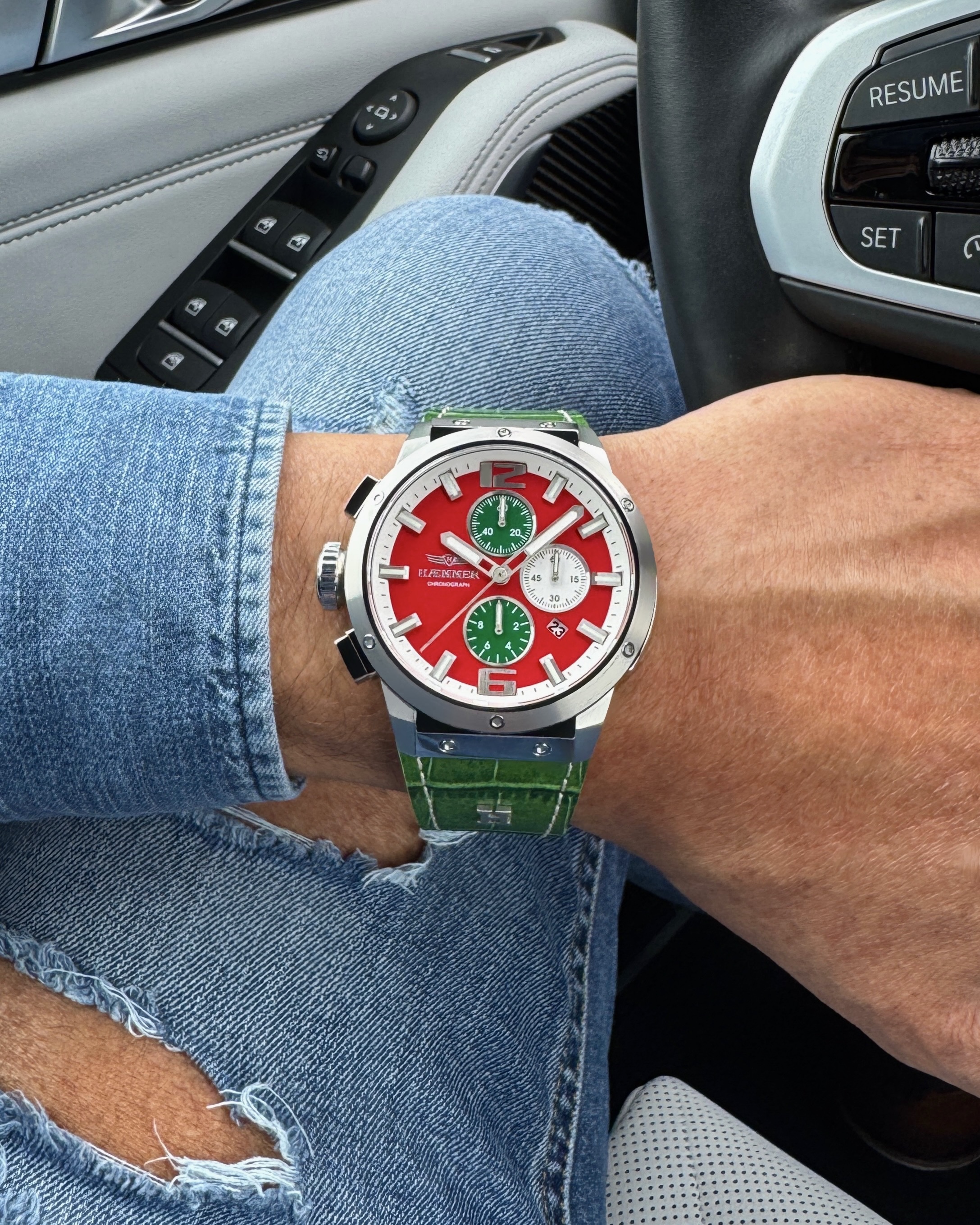 Das signalstarke Rot des Zifferblatts ist ein Symbol des reinen, ungebändigten Willens und des Feuers, das dich antreibt. Es ist die unübersehbare Kraft, die von dir ausgeht. Das selbstbewusste Grün des Armbands und der Akzente steht dabei für die Beharrlichkeit und die natürliche Dominanz, mit der du deinen Raum einnimmst.