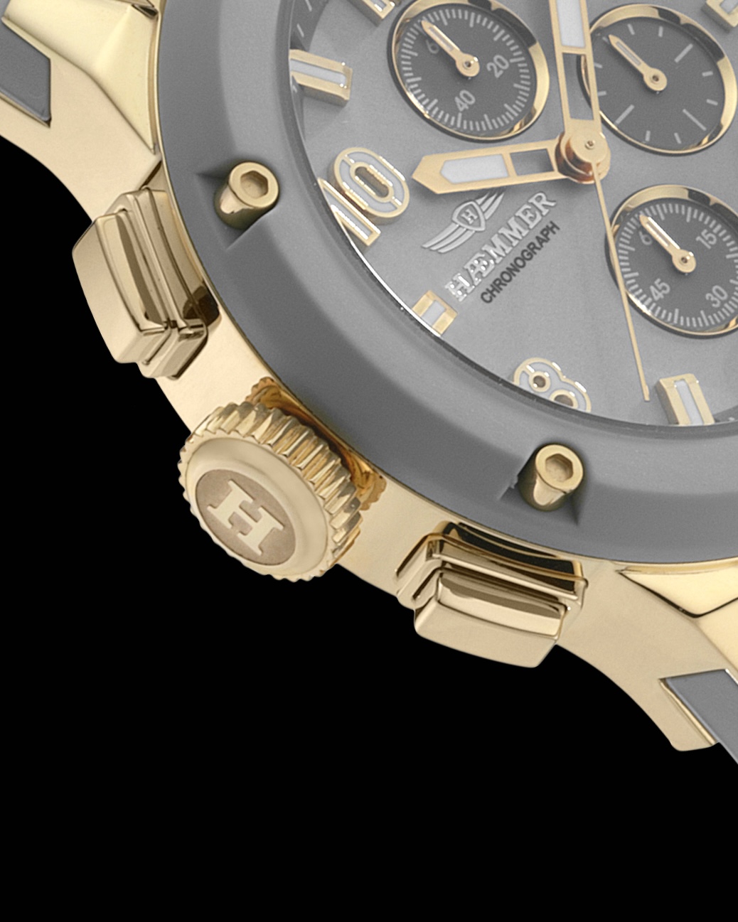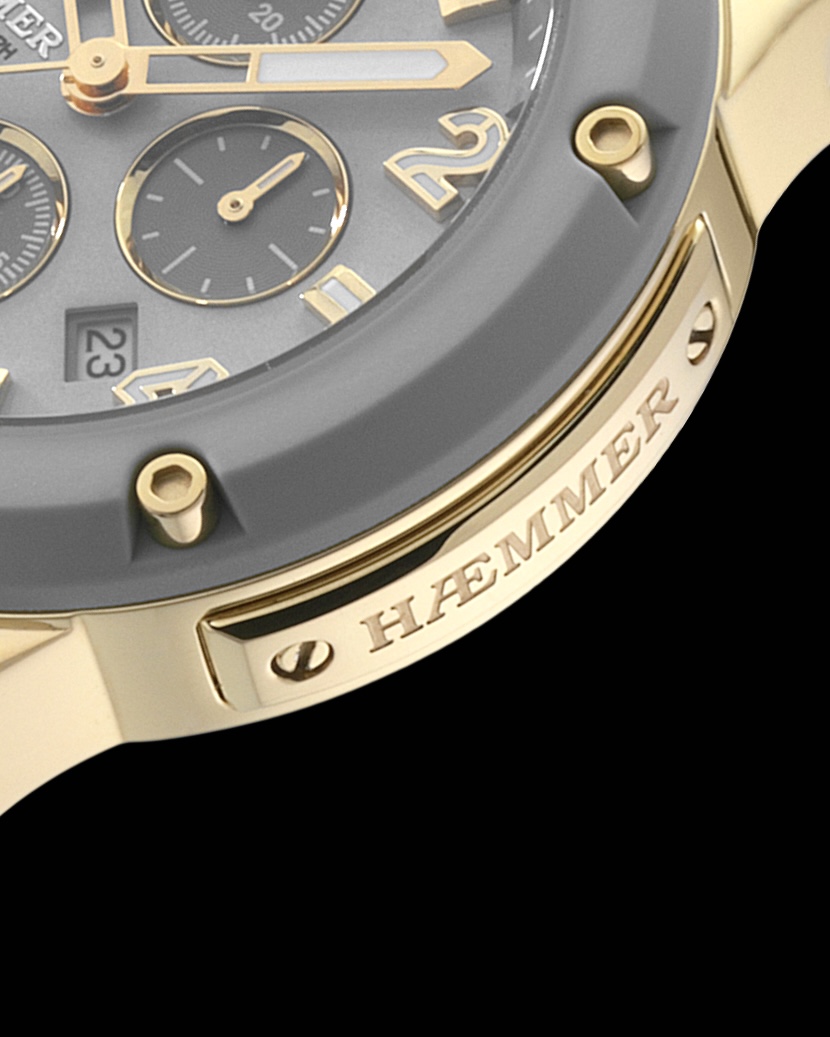 | Edelstahlelemente: | "HÆMMER" Lasergravur auf poliertem 316L Edelstahl, Beschichtung: IP-Gold |