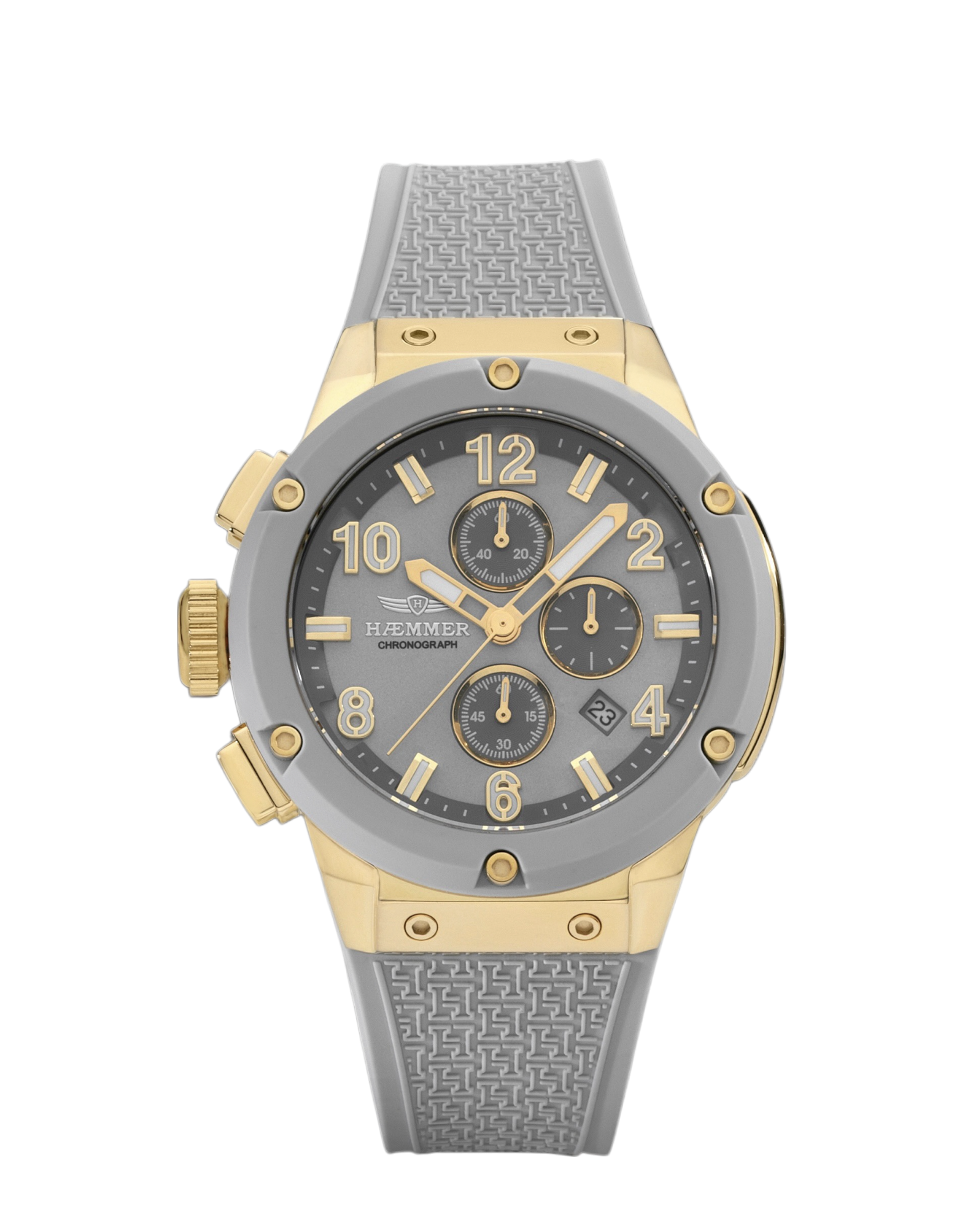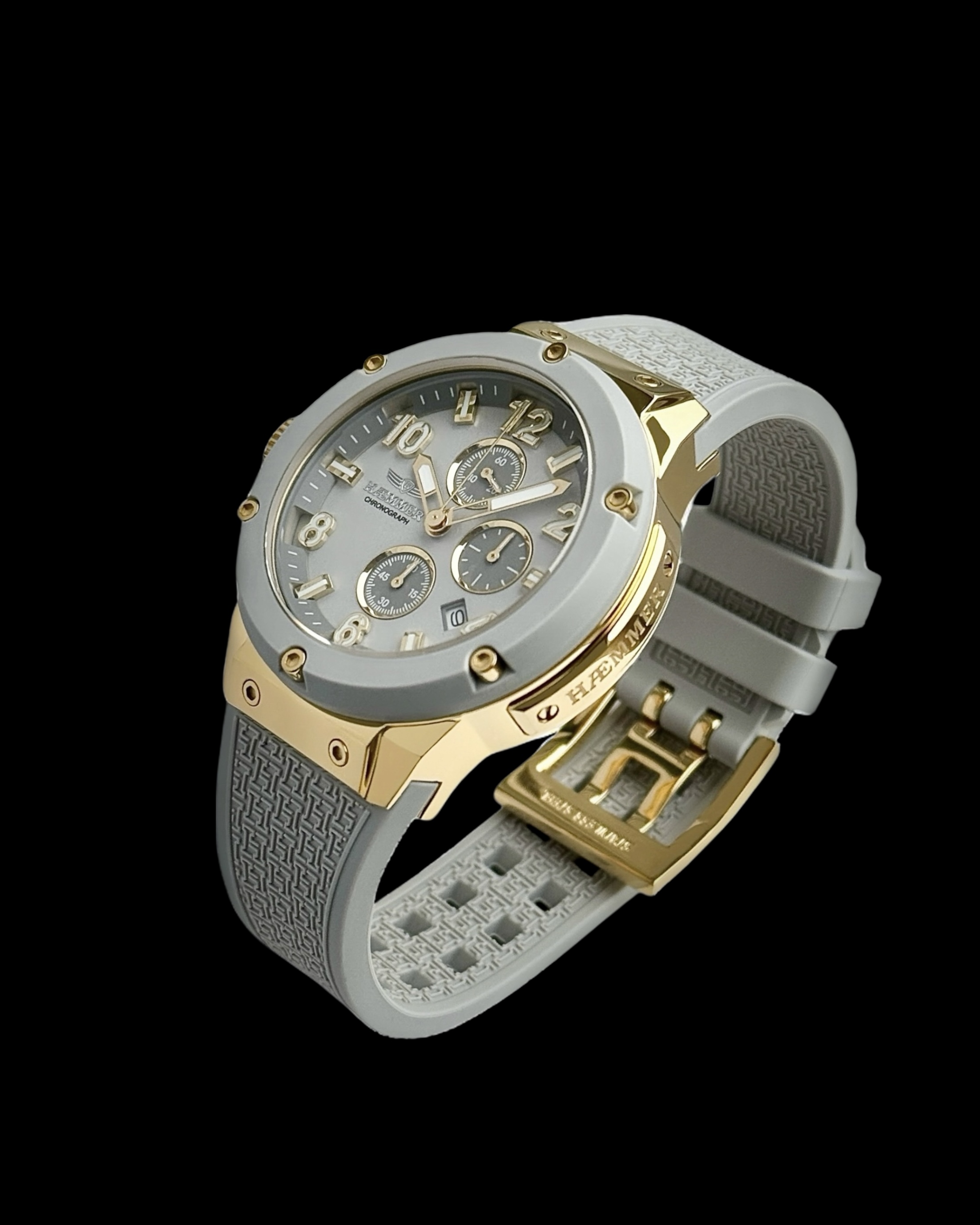 Das hypoallergene Silikonarmband in elegantem Grau liegt sanft auf der Haut, robust und stilvoll zugleich. Goldene Akzente an Lünette und Krone verleihen dem Design eine warme Tiefe – wie Sonnenlicht auf Stein. Das fein gearbeitete Zifferblatt reflektiert das Licht wie eine stille Wasseroberfläche: ruhig, klar, voller Charakter.