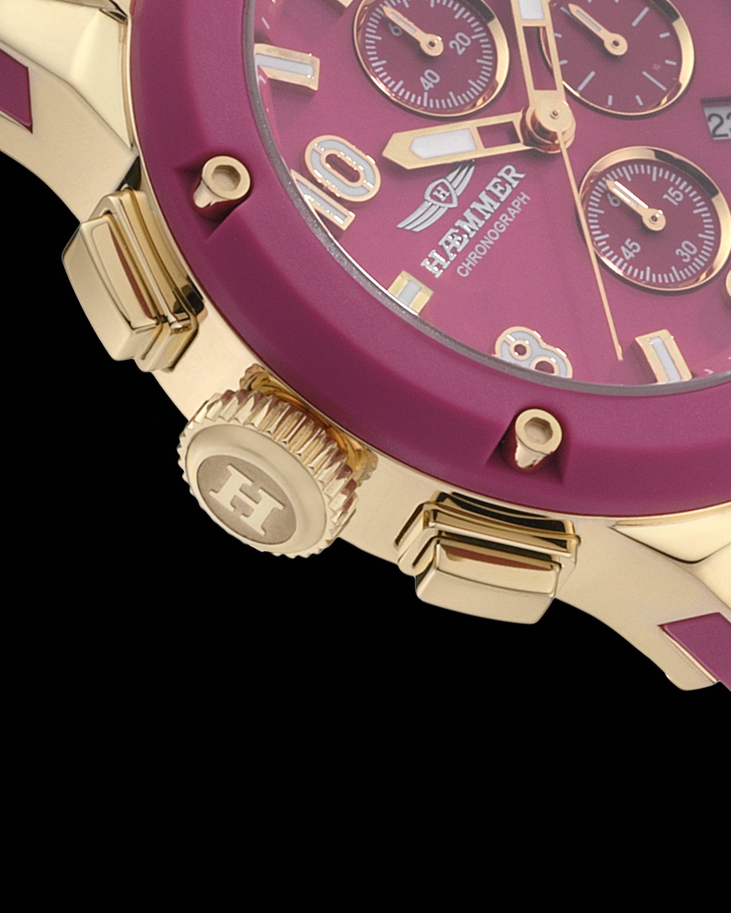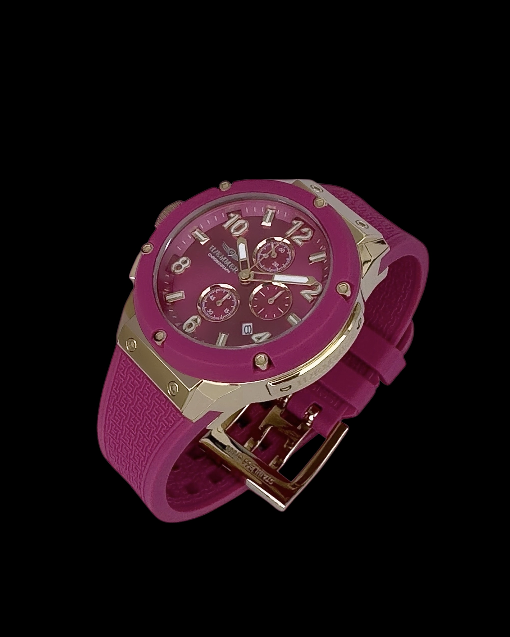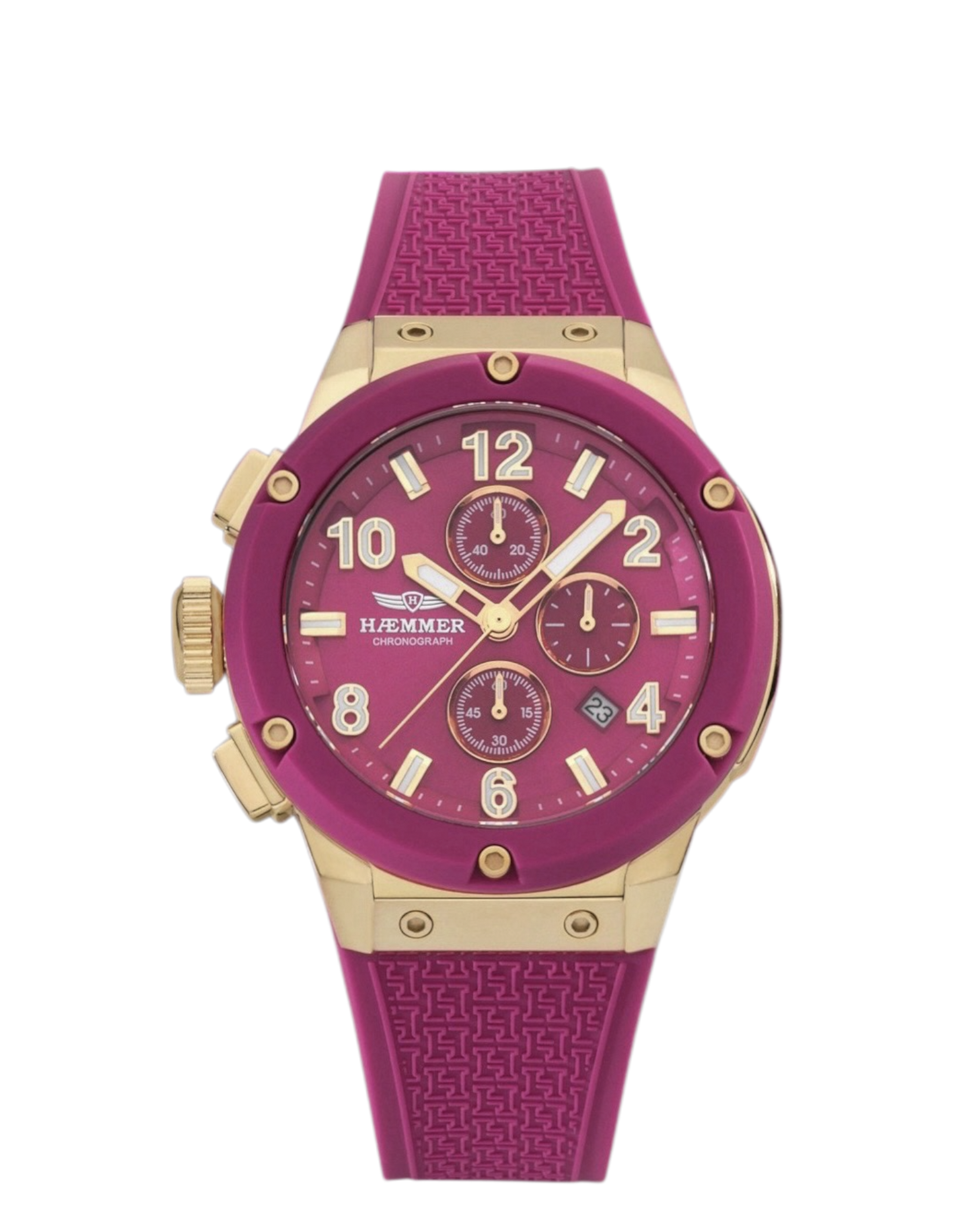 Mit ihrer intensiven Pinknuance und den goldenen Details ist diese Uhr ein