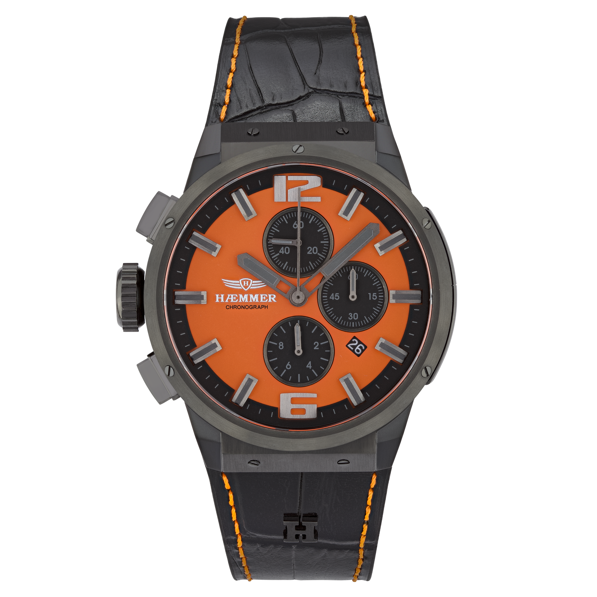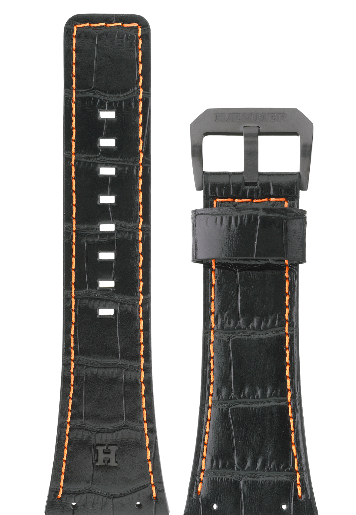 | Armband & Schließe: | IP-Black beschichtet, Krokogeprägtes Kalbsleder-Armband, aus gebürsteten 316L Edelstahl (matt), mit Dornschließe |