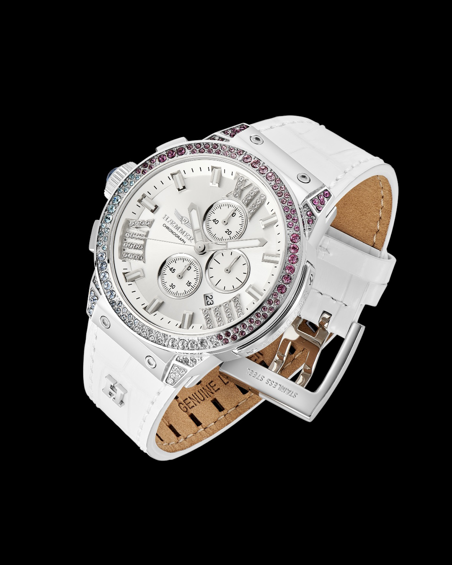 Mit ihrer klaren Ästhetik, den schimmernden Swarovski-Kristallen auf der Lünette und dem weißen Armband ist sie mehr als ein stilvolles Accessoire – sie ist ein Ausdruck von Haltung.