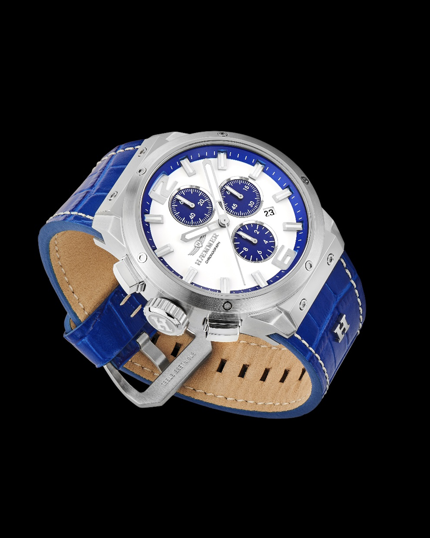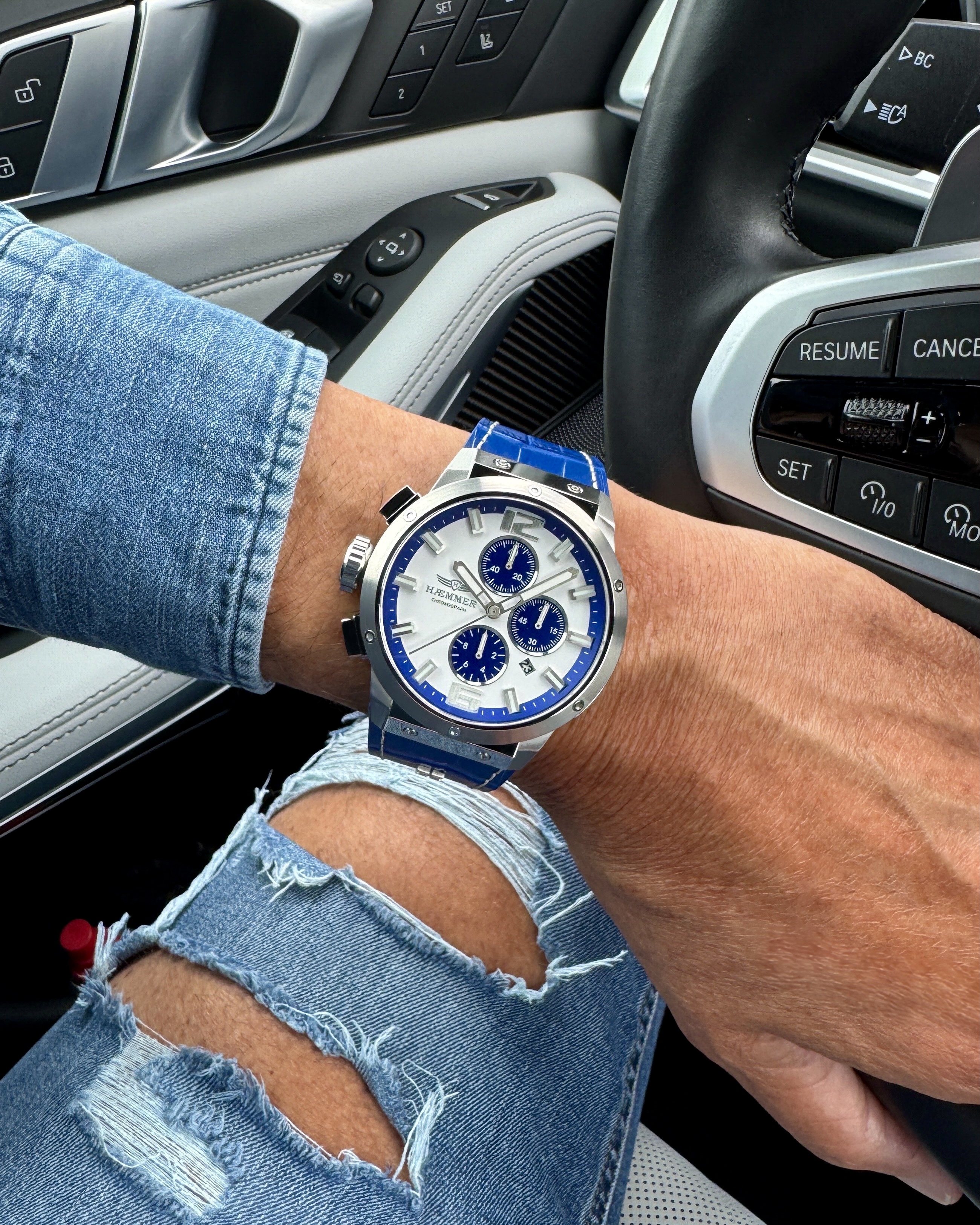 Das tiefe Blau ist das visuelle Versprechen von unaufhaltsamer Bewegung und kompromisslosen Fokus. Es symbolisiert die mentale Stärke, die jedes Detail des Handelns kontrolliert, um maximale Leistung zu erzielen. Das klare Weiß des Zifferblatts ist dabei die Leinwand für die absolute Präzision der Chronographen-Funktion.
