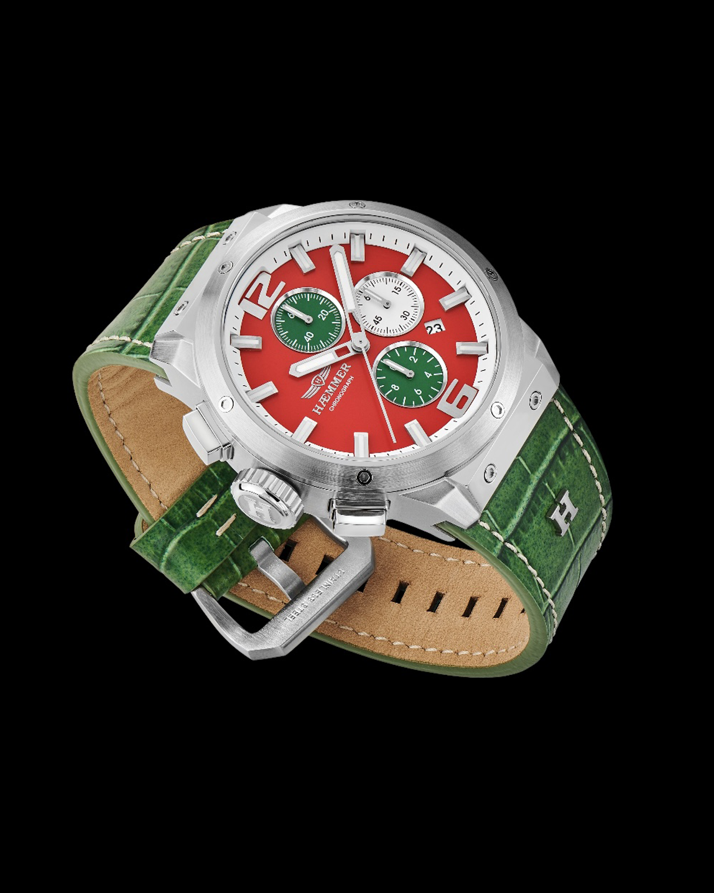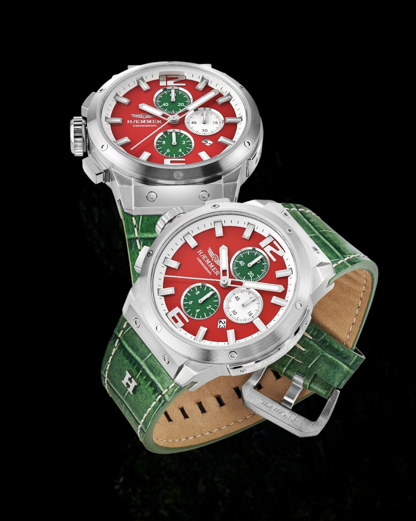 Das signalstarke Rot des Zifferblatts ist ein Symbol des reinen, ungebändigten Willens und des Feuers, das dich antreibt. Es ist die unübersehbare Kraft, die von dir ausgeht. Das selbstbewusste Grün des Armbands und der Akzente steht dabei für die Beharrlichkeit und die natürliche Dominanz, mit der du deinen Raum einnimmst.